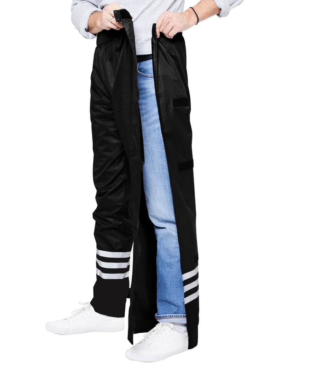 Oui, le pantalon dispose d’une ouverture intégrale le long de la jambe avec velcros, permettant de l’enfiler rapidement sans retirer ses chaussures.