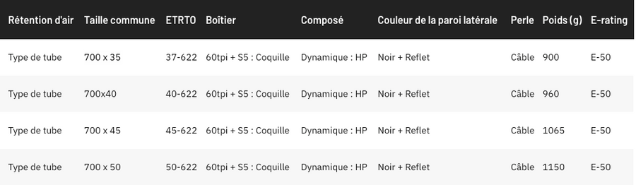 Le pneu est proposé en 700x35 (ETRTO 37-622), 700x40 (40-622), 700x45 (45-622) et 700x50 (50-622). Il s’agit d’un pneu Tube Type avec tringle rigide (Wire bead).