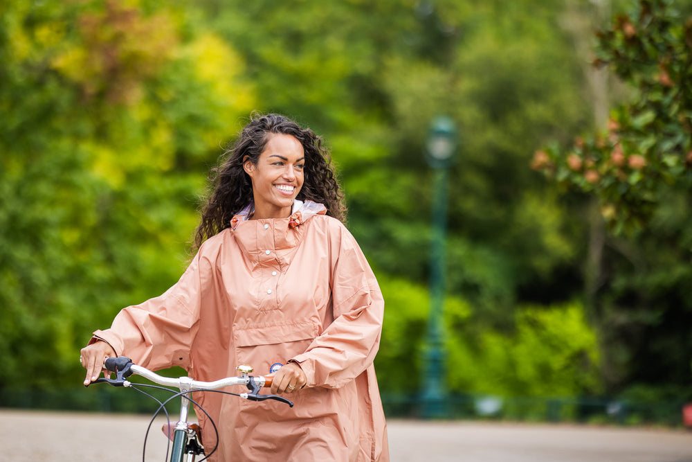 The Le Temps des grenouilles rain poncho has been improved for cycling. It features handlebar straps and a retaining belt to prevent it from flying off.