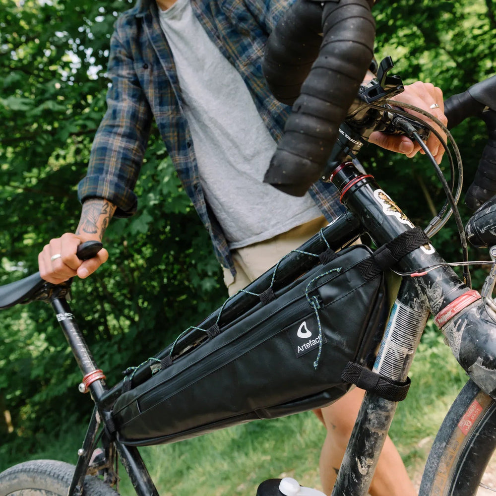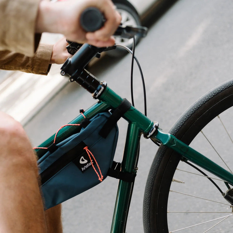 The Artefact frame bag is available in two sizes: 3.5 L or 4 L. It adapts to most frame geometries thanks to its streamlined design and strap fastening. Compact yet spacious, it allows you to carry tools, a snack, a windbreaker, or a power bank, whether you're commuting or on a bikepacking adventure.
