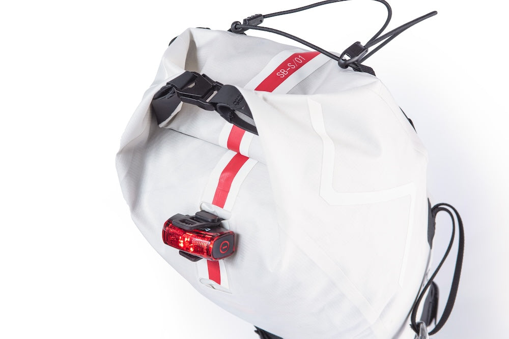 At 228g, this bag weighs almost nothing on the rack, while offering a usable volume of 8L - ideal for a compact sleeping bag, a mattress and a change of clothes. When riding, its volume can be reduced to 5L thanks to the roll-top system.
