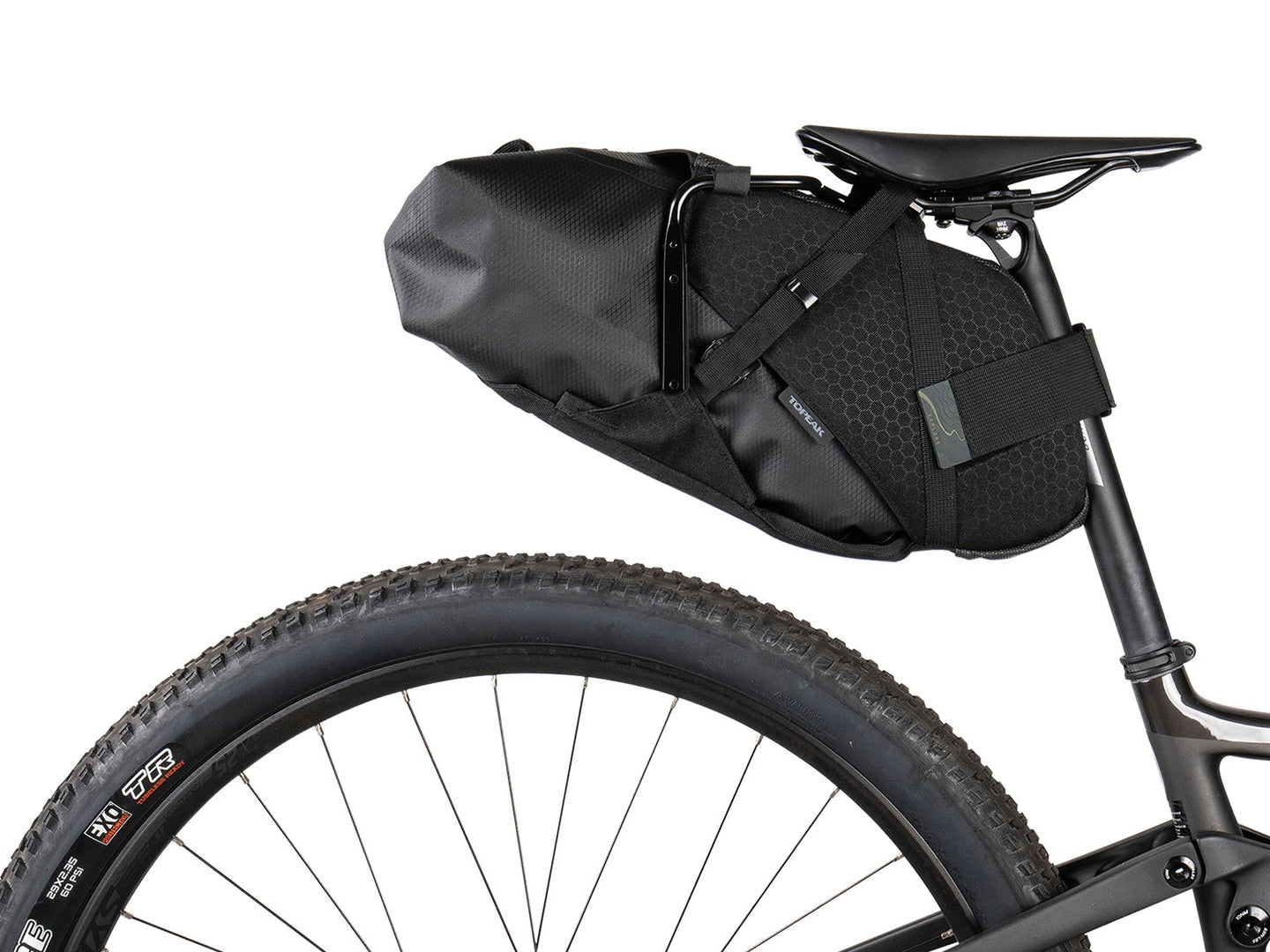 The BackLoader X attaches to the seat post and saddle rails using a rigid external harness and durable Velcro straps.