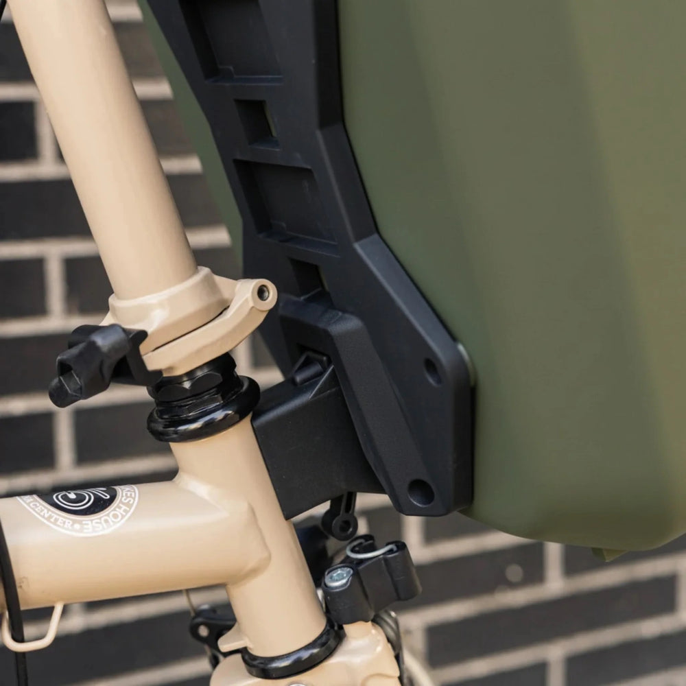 La sacoche s’adapte parfaitement au support avant des vélos Brompton grâce à son ancrage exclusif. Ce système permet une installation simple et sécurisée sans compromettre la maniabilité du vélo. Grâce à son design frontal équilibré, le poids reste centré pour préserver le confort de conduite.